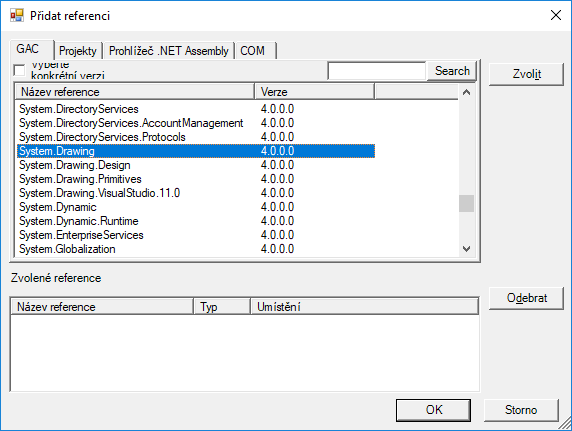 V dialogu Add Reference vyhledejte a vyberte v seznamu položky System.Drawing a System.Windows.Forms. Chcete-li provést vícenásobný výběr, podržte klávesu Ctrl. Příklad: