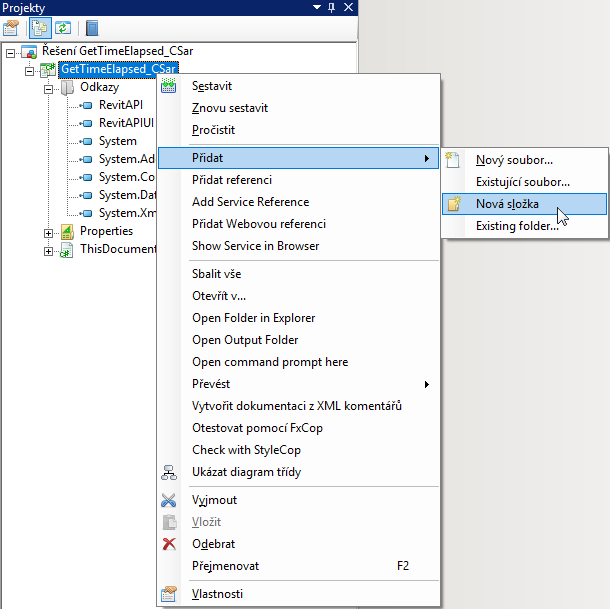 Vraťte se do integrovaného vývojového prostředí Revit. V nástroji Project Explorer (stále v tomto příkladu) klikněte pravým tlačítkem myši na složku, kterou jste pro makro vytvořili, a z nabídky vyberte příkaz Add