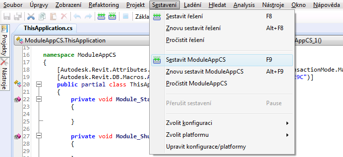 - V integrovaném vývojovém prostředí Revit makro vyberte v rozevíracím seznamu Sestavení danou možnost makra.