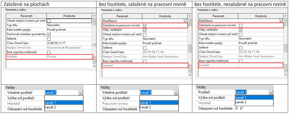 Definice obsahu také ovlivní, jaká vlastnost související s úrovní je dostupná. Hodnota vlastnosti na úrovni výkazu existuje u prvků založených na plochách a u prvků bez hostitele založených na pracovní rovině. Prvky bez hostitele nezaložené na pracovní rovině nemají vlastnost Úroveň výkazu. Místo ní mají vlastnost Úroveň, jak je shrnuto v následující tabulce: