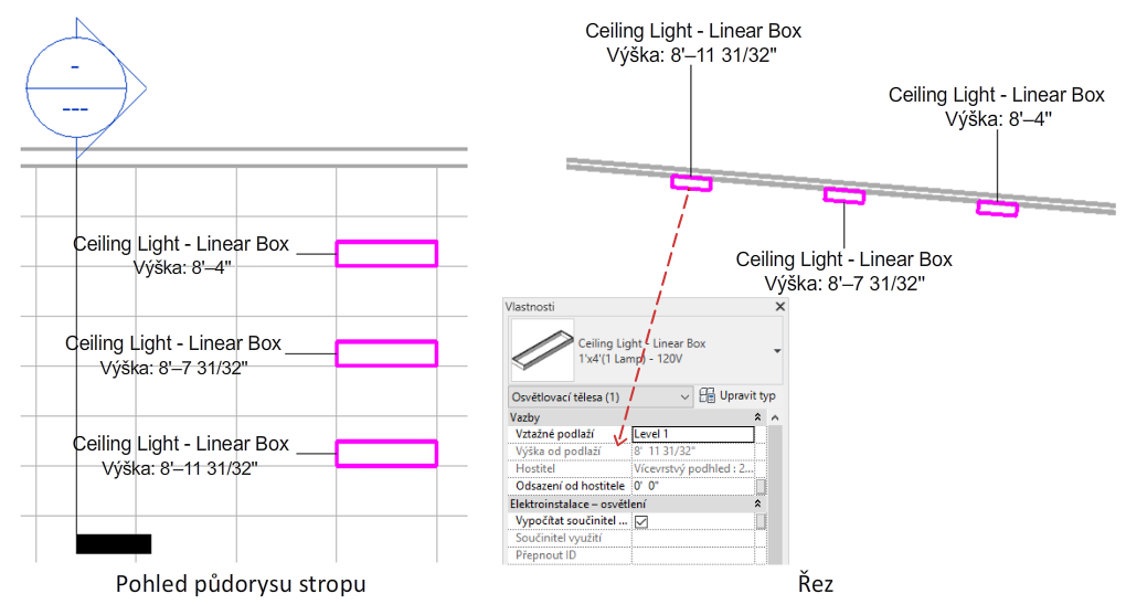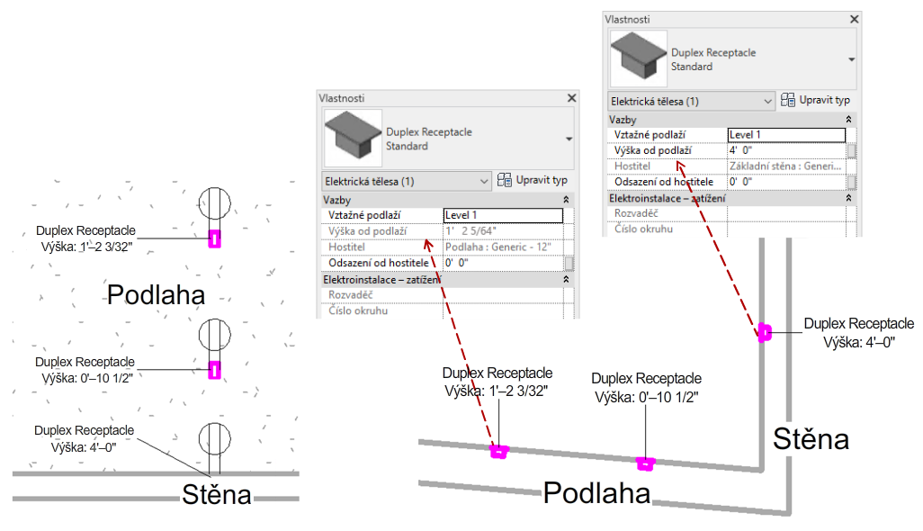 Parametr Výška od úrovně není možné upravit, pokud je prvek umístěn na jiném než vertikálním povrchu, například v případě, kdy je zásuvka umístěna na podlaze nebo kdy je osvětlovací těleso umístěno na podhledu.