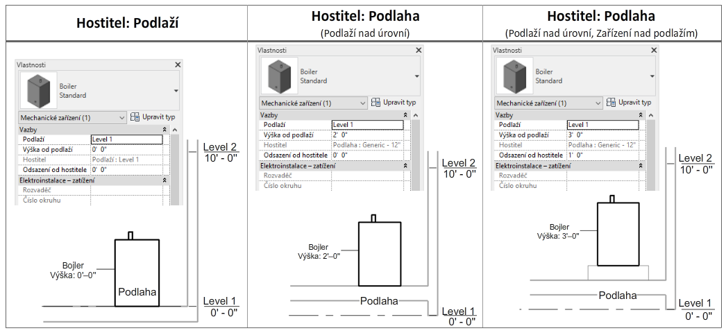V níže uvedeném příkladu je podlaha ve výšce 2' 0" nad úrovní. Pokud je na podlahu umístěn kotel, hodnota parametru Výška od úrovně = 2' 0" a hodnota parametru Odsazení od hostitele = 0' 0".
