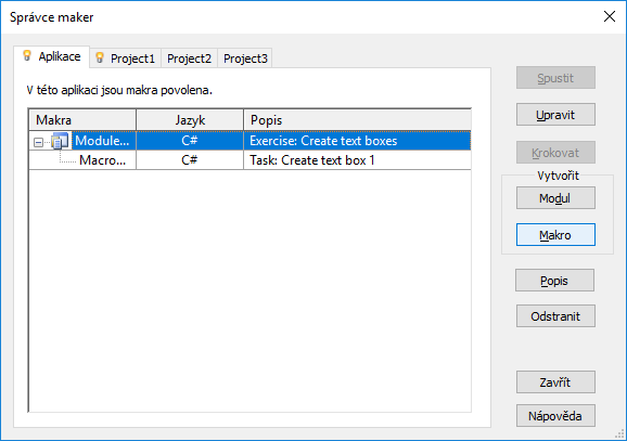 Nové makro bude umístěno do nadřízeného modulu ve Správci maker.