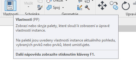 Jestliže ponecháte kurzor nad nástrojem pásu karet, zobrazí ve výchozím nastavení aplikace Revit nápovědu k nástroji. Místní nápověda podává krátký popis nástroje. Jestliže ponecháte kurzor nad nástrojem pásu karet po delší dobu, zobrazí se doplňkové informace, pokud jsou k dispozici. Při zobrazené místní nápovědě můžete stisknout klávesu F1, čímž dojde k zobrazení kontextové nápovědy s dalšími informacemi o nástroji.