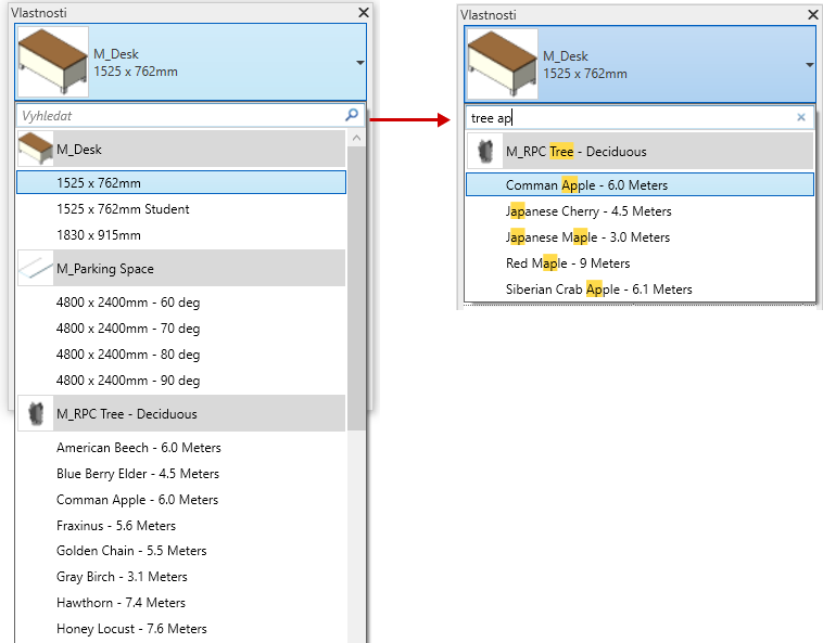 Revit a usnadňuje výběr v seznamu s větším počtem možností. Můžete prohledat následující funkční oblasti: