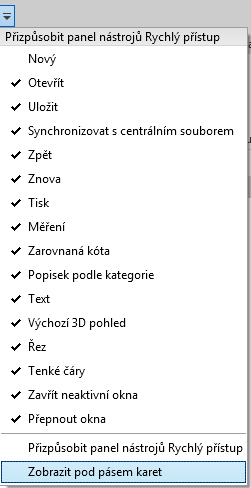 Panel nástrojů Rychlý přístup je možné zobrazit nad nebo pod pásem karet. Chcete-li provést změnu nastavení, na panelu nástrojů Rychlý přístup klikněte na rozevírací seznam Přizpůsobení panelu nástrojů Rychlý přístup