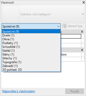 Bezprostředně pod seznamem Výběr typu se nachází filtr určující kategorii prvků, které budou pomocí nástroje umístěny, nebo kategorii a počet prvků vybraných na kreslicí ploše. Při výběru více kategorií nebo typů se na paletě zobrazí jen ty vlastnosti instancí, které jsou pro všechny společné. Když je vybráno více kategorií, můžete pomocí rozevíracího seznamu filtru zobrazit pouze vlastnosti určité kategorie nebo samotného pohledu. Volba specifické kategorie neovlivní celkovou sadu výběru.
