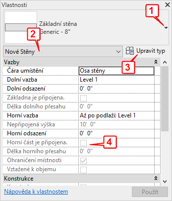 Při prvním spuštění aplikace Revit je paleta Vlastnosti otevřená a ukotvená nad Prohlížečem projektu na levé straně kreslicí plochy. Pokud později paletu Vlastnosti zavřete, můžete ji znovu otevřít kterýmkoliv z následujících způsobů: