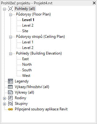Prohlížeč projektu zobrazuje logickou hierarchii všech pohledů, výkazů, výkresů, rodin, skupin a dalších částí aktuálního projektu. Postupně jak rozbalujete a sbalujete jednotlivé větve zobrazují se položky nižší úrovně.