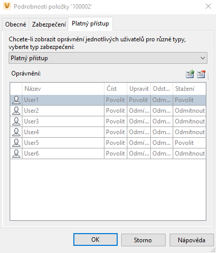 - Výběrem karty Platný přístup zobrazte oprávnění uživatelů k objektům.