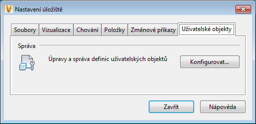 Správci mohou vytvářet, upravovat a odstraňovat definice uživatelských objektů. Všechna nastavení správy uživatelských objektů jsou dostupná v dialogu Nastavení úložiště na kartě Uživatelské objekty kliknutím na tlačítko Konfigurovat.