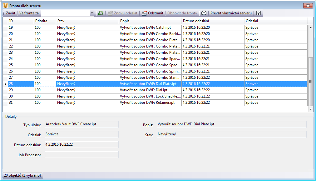Typ úlohy, který byl odeslán ke zpracování. Úlohy vizualizace se zobrazují ve formátu Autodesk.Vault.DWF.Create, kde DWF je přípona souboru. |