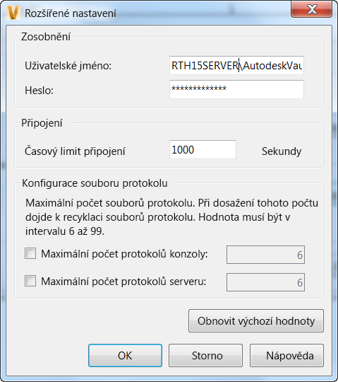 V dialogu Pokročilé nastavení v konzoli serveru souborů aplikace Autodesk Vault můžete konfigurovat nastavení účtu zosobnění, mezní hodnotu časového limitu a počet protokolů konzole a serveru, které chcete zachovat.