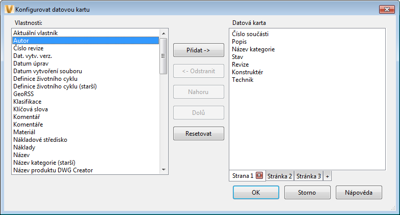 V dialogu Konfigurace datové karty můžete spravovat karty a stanovovat které vlastnosti budou moci uživatelé CAD upravovat. Seznam vlastností zobrazí všechny vlastnosti které lze na vybranou kartu přidat. Každá vlastnost lze na jednu kartu přidat pouze jednou. Na několika různých kartách se však může nacházet stejná vlastnost.