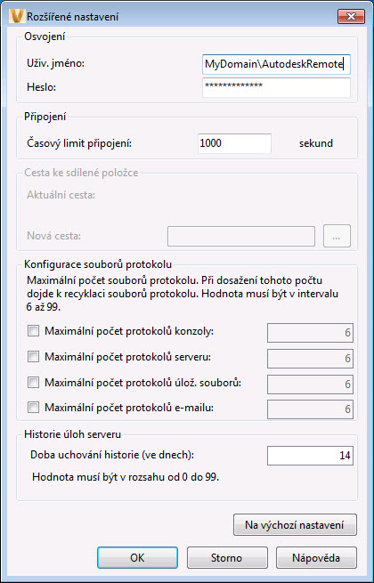 - V dialogu Pokročilé nastavení změňte uživatelské jméno na hodnotu MyDomain\AutodeskRemote a zadejte odpovídající heslo.