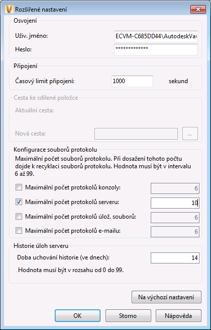 Umožňuje konfigurovat počet protokolů konzole, serveru a e-mailu, které zůstanou zachovány v aplikaci Vault Server .