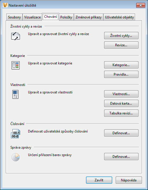 Karta Chování v dialogu Nastavení úložiště obsahuje možnosti k úpravám definic životního cyklu, správě revizí, správě kategorií a pravidel, vytváření a úpravám vlastností, definování vlastních způsobů číslování a přiřazování barev ve zprávách.