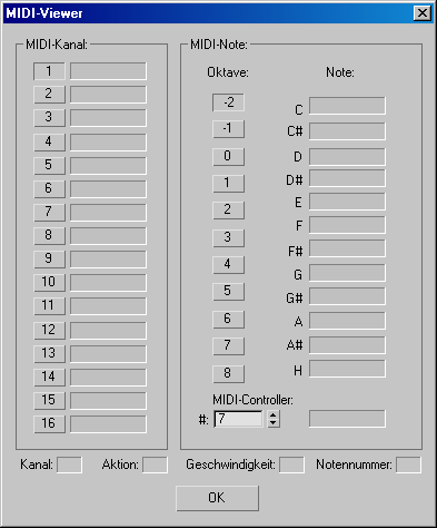 - MIDI-Controller Gibt eine Notenaktion an, wenn eine andere Art von MIDI-Controller als ein typisches Keyboard angeschlossen ist. Wenn Sie beispielsweise eine MIDI-Sliderbox verwenden, wählen Sie die Option "MIDI-Controller" und geben dann mit dem Zahlenauswahlfeld "#" die Notenaktion für die einzelnen Regler an.
