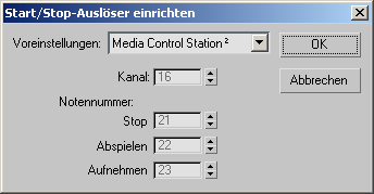 - Öffnet das Dialogfeld Start/Stopp-Auslöser einrichten. Sie können die Art des MIDI-Geräts wählen, das die Aufnahme steuern soll.