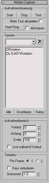 - Öffnen Sie in der Dienstprogrammgruppe das Dienstprogramm "Motion Capture". Sie können die Bewegung für jede Kombination von Spuren über einen beliebigen Frame-Bereich testen und aufnehmen.