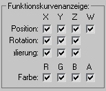 Aktivierte Kontrollkästchen in dieser Gruppe geben an, welche Transformationen für welche Achsen unterdrückt werden und welche RGB-Farbwerte unterdrückt werden. Dies wird nur für Controller wie den Bezier-Positions-Controller verwendet, welcher alle drei Achsen mit einer ausgewählten Spur anzeigt.