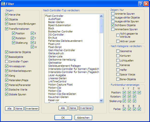 Anmerkung: Die Filter "W" und "A" sind für die Verwendung mit dem Point4-Controller bestimmt. W ist einfach ein vierter Filter für Position, und der Filter A ist für die Verwendung mit dem Gleitkomma-RGBA-Controller (welcher auf dem Point4-Controller basiert) bestimmt.