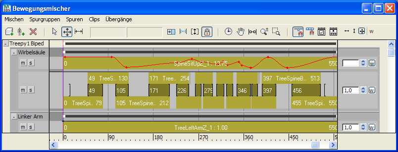 Jede Spur besitzt mindestens eine Gewichtungskurve, mit deren Hilfe Sie die Bewegungen aus mehreren Spuren zusammenmischen und dabei im Laufe der Animation variieren können. Die Gewichtungskurve bestimmt, wie groß der Anteil einer bestimmten Spur an der Bewegung innerhalb der Spurgruppe ist.