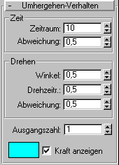 - Gibt den maximalen Betrag für die Winkelvariation an. Jedes Mal, wenn ein Zeitraum endet, nimmt Character Studio eine zufällige Zahl zwischen dem negativen und positiven Wert der Einstellung "Abweichung", multipliziert diese mit der Einstellung "Winkel" und addiert das Ergebnis zum Winkel. Vorgabe = 0,5; Bereich = 0,0 bis 1,0.