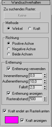 Das Wandsuchverhalten zieht Vertreter mithilfe eines Rasterobjekts an. Wenn Vertreter von der Wandsuchkraft beeinflusst werden, drehen sie sich, bis sie sich auf das Raster zu bewegen. Dieses Verhalten ist praktisch, wenn Sie Objekte auf einen rechteckigen Bereich zu bewegen möchten, z. B. auf eine Tür.
