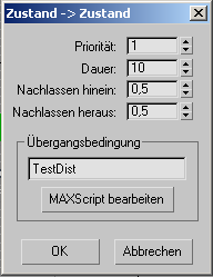 Der Eröffnungsabschnitt enthält "fn" (Funktion) gefolgt vom Funktionsnamen, der auch im Dialogfeld "Zustandsübergang" vorhanden sein muss, dann den Eingabeparametern "del t", und zuletzt "= (". Darauf kann kein oder ein beliebiger MAXScript-Code folgen.