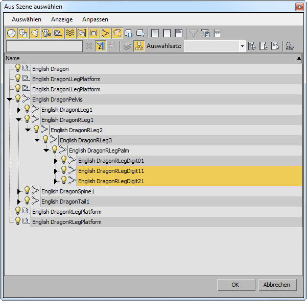Das Dialogfeld ist modusabhängig, deshalb erfolgt keine automatische Synchronisation zwischen den markierten Einträgen in der Liste und der Auswahl der entsprechenden Objekte in der Szene. Um eine Auswahl vorzunehmen, verwenden Sie zuerst das Dialogfeld zum Markieren der Objekte, die ausgewählt werden sollen, und klicken dann auf "OK", um das Dialogfeld zu schließen und die Objekte auszuwählen.