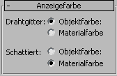 Über das Rollout Anzeigefarbe können Sie festlegen, ob 3ds Max für die Anzeige von Objekten die Drahtgittermodellfarben (auch als Objektfarben bezeichnet) oder die Streufarben des Materials verwenden soll, wenn die Anzeige-Eigenschaften der Objekte auf Nach Objekt eingestellt sind.