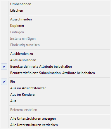 Einige Befehle für die Verwaltung von Modifikatoren stehen nach einem Klick mit der rechten Maustaste auf die Modifikatorstapelanzeige zur Verfügung. Einige Optionen stehen nicht zur Verfügung, wenn sie auf den aktuellen Modifikator nicht zutreffen. Zum Beispiel steht die Option "Eindeutig zuweisen" nur zur Verfügung, wenn Sie eine Modifikator-Instanz auswählen.