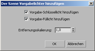 Fügt der Szene das Vorgabe-Fülllicht hinzu. Das Fülllicht befindet sich hinter der Szene und rechts davon. Das Fülllicht wird zu einem Omnilicht mit dem Namen "DefaultFillLight". Vorgabe = Aktiviert.