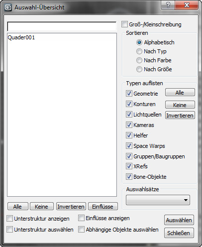 Sie können auch einzelne Objekte in der Liste markieren und auswählen, indem Sie auf den entsprechenden Namen doppelklicken.