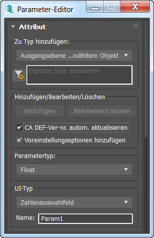 Anmerkung: Wenn Sie "Aktueller Modifikator von ausgewähltem Objekt" ausgewählt haben und mehrere Modifikatoren im Stapel markiert sind, wenn Sie auf "Hinzufügen" klicken, wendet der Parametereditor das benutzerdefinierte Attribut auf den ersten markierten Modifikator an und entfernt die Markierung der anderen Modifikatoren.