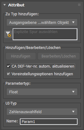 - Wendet den Parameter des benutzerdefinierten Attributs auf das aktuelle Objekt, den aktuellen Modifikator, das aktuelle Material oder die aktuelle Spur an, je nach der Auswahl in der Liste "Zu Typ hinzufügen".