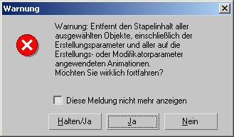 Sie werden in einem Warndialogfeld daran erinnert, dass der Ausblendevorgang nicht rückgängig gemacht werden kann, und Sie erhalten die Möglichkeit, den Vorgang anzuhalten, bevor das Objekt umgewandelt wird.