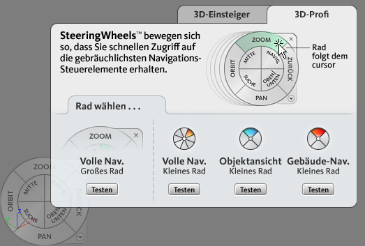 Vorgabemäßig ist das Rad beim Start inaktiv. Wenn Sie jedoch die Option Immer fixiertes Rad beim Start anzeigen aktivieren, wird das Rad beim Start an die linke untere Ecke des Ansichtsfensters Perspektive geheftet. Es folgt dem Cursor nicht, und wenn Sie den Cursor über dem Rad positionieren, wird die Info-Sprechblase für SteeringWheels angezeigt. Die Info-Sprechblase dient als Einführung in den Zweck der Räder und ihre Verwendung.