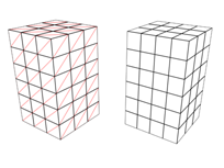 Aktiviert bzw. deaktiviert die Anzeige von ausgeblendeten Flächenkanten und Polygondiagonalen. Wenn diese Option aktiviert ist, werden nur die äußeren Kanten angezeigt. Ist es deaktiviert, wird die gesamte Netzgeometrie angezeigt. Dies gilt sowohl für Ansichtsfenster mit Drahtgittermodellanzeige als auch für andere Modi, in denen die Option "Flächen mit Kanten" aktiviert wurde.