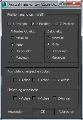 3ds Max öffnet das Dialogfeld "Auswahl ausrichten". Ziehen Sie das Dialogfeld etwas beiseite, wenn Sie das aktive Ansichtsfenster nicht ganz sehen können.