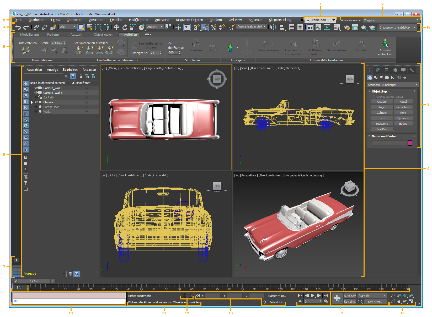 Die Benutzeroberfläche von 3ds Max umfasst Steuerelemente, Statusinformationen und Ansichtsfenster, in denen Sie Ihre Szene bearbeiten und anzeigen können.