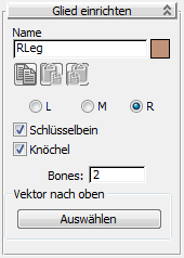 Glieder können aus einer Reihe verschiedener Unterelemente bestehen. Hierzu gehören Schlüsselbein, Bones und Handflächen. Die Master-Parameter für das Glied sind im Rollout "Glied einrichten" zu finden.