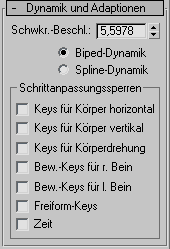 Mit den Steuerelementen im Rollout "Dynamik und Adaptionen" können Sie angeben, wie Sie die Biped-Animation erstellen möchten. Mit den Parametern können Sie die Schwerkraft ändern, die Dynamikeigenschaften für Keys aus neu generierten Schritten festlegen sowie die Anzahl der Transformationsspuren für den Biped ermitteln. Außerdem können Sie verhindern, dass Keys angepasst werden.