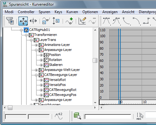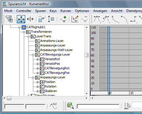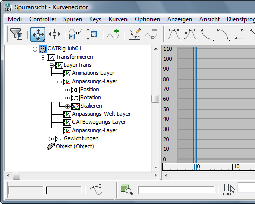 Zur Vereinfachung des Arbeitsbereichs zeigt CAT vorgabemäßig nur die Controller und Keyframes für den aktiven Layer an. Wenn Sie an einem Layer arbeiten, können Sie die Auswirkungen leichter nachvollziehen, wenn nur die Keyframes des aktiven Layers dargestellt werden.