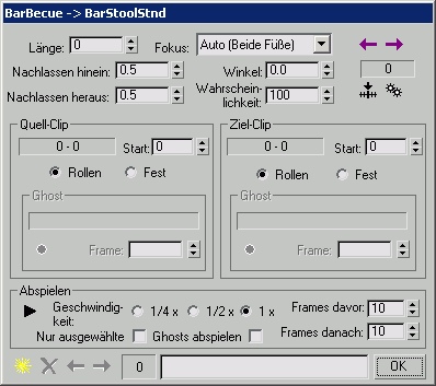 In den Zahlenauswahlfeldern im Bereich "Ghost" können Sie den Quell-Clip und den Ziel-Clip einsehen und weiterspulen, indem Sie Strichmännchen (Ghosts) anzeigen lassen. Das gelbe Strichmännchen stellt den Quell-Clip dar, das rote den Ziel-Clip. Die Bipeds aus beiden Clips sind unter Umständen beim Spulen noch weit voneinander entfernt. Der Ziel-Clip verändert jedoch seine Position, nachdem Sie auf "Start-Frame festlegen" klicken. Wenn ein geeignetes Start-Frame gefunden wurde, klicken Sie auf "Start-Frame festlegen", damit die Werte aus dem Feld "Frame" in das Feld "Start-Frame" übertragen werden. Achten Sie darauf, ob der Status der Fußposition im angegebenen Feld korrekt ist.