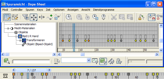 Farbcodierte Biped-Keys in der Spuransicht und auf der Spurleiste
