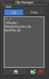 Der Clip-/Posen-Manager stellt Steuerelemente zum Laden und Speichern von Animations-Clips und Stellungen bereit. Verwenden Sie die Schaltflächen "Clip" und "Pose", um zwischen Clip- und Posen-Manager zu wechseln (der Name des Rollouts lautet immer "Clip-Manager").