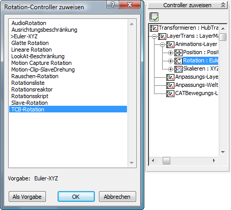 Die TCB-Quaternion-Interpolation bietet in vielen Fällen eine bessere Rotationsinterpolation und wird daher oft als das überlegene Verfahren für die Figurenanimation angesehen. Der Nachteil der TCB-Quaternion-Interpolation ist, dass die Animation nicht in Form von Kurven im Kurveneditor betrachtet werden kann.