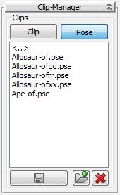 Der Posen-Manager ermöglicht Ihnen das Speichern der aktuellen Rotationen der Teile des Rigs in einer Datei. Die Daten werden in textbasierten PSE-Dateien gespeichert.